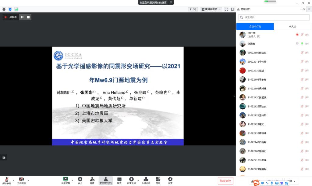2023年1月6日,中国地震局地质研究所张国宏研究员应邀为太阳成集团tyc122ccvip师生作了题为“基于光学遥感影像的同震形变场研究——以2021年Mw6.9门源地震为例”的学术报告。本次报告采用线上进行,太阳成集团tyc122ccvip孙广通副教授主持了报告,公司部分师生聆听了本次报告。